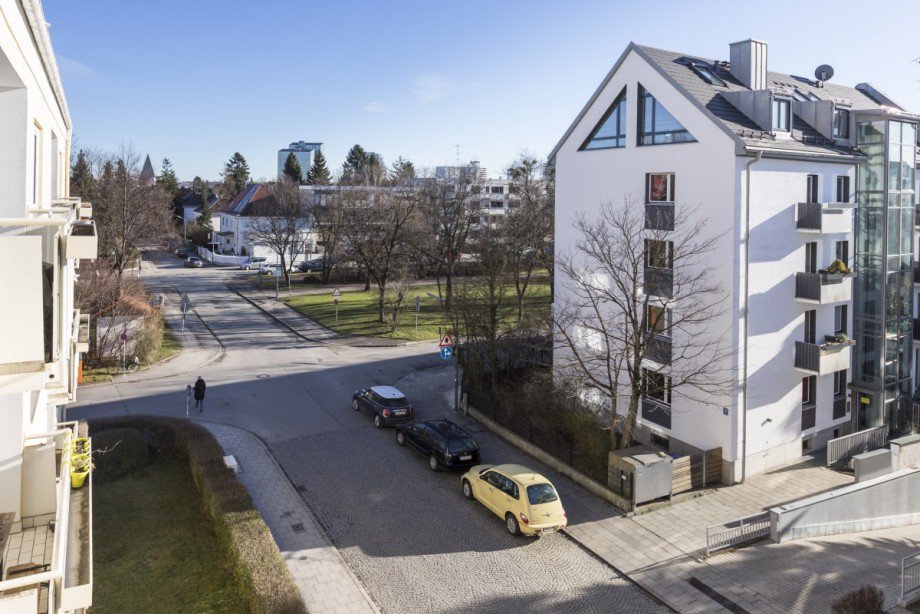 Der Blick vom Balkon reicht über die Dächer bis hin zum nahe gelegenen Petuelpark.