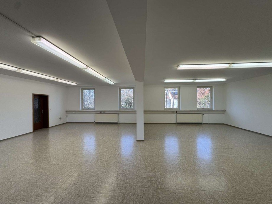 Die rechte Seite der Immobilie verfügt ebenfalls über einen großzügigen, hellen Hauptraum, der vielfältig nutzbar ist - etwa als offenes Büro, Studiofläche oder Gemeinschaftsraum. Zwei weitere abgeschlossene Räume mit Türen bieten zusätzliche Nutzungsmöglichkeiten, zum Beispiel für Beratung, konzentriertes Arbeiten oder vertrauliche Gespräche.